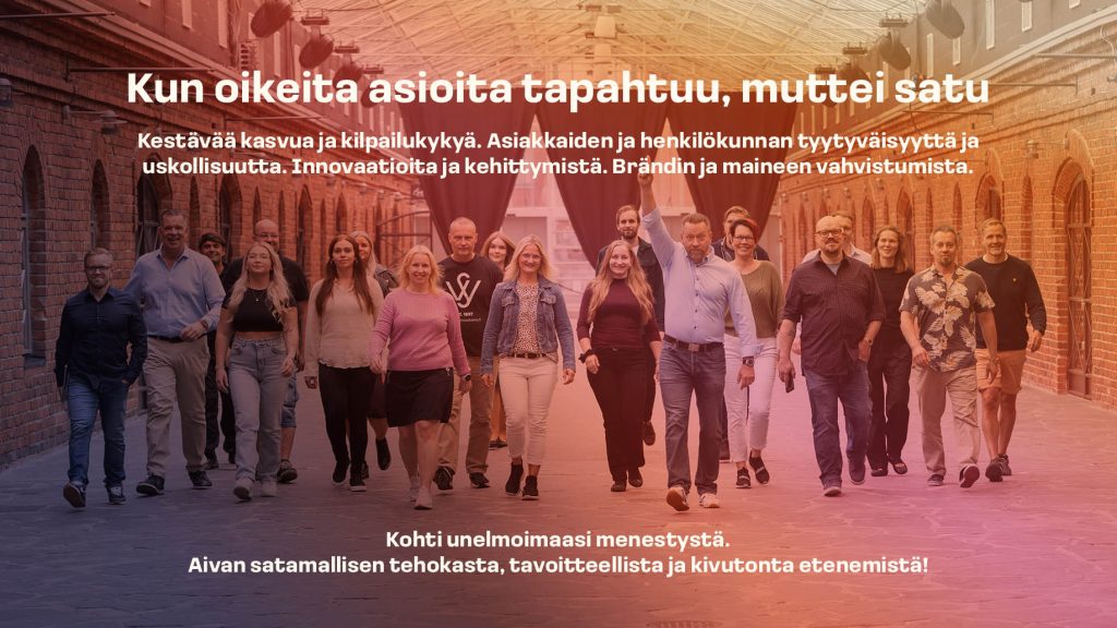 Kun olimme ankkuroineet oikean positiomme, pääsimme johdonmukaiseen luovaan työhön. Loimme konseptin, jonka keskiössä on asiakkaan liiketoiminnan tavoitetila. Se tavoittamisen arvoinen, sekä keskipitkän että pitkän aikavälin tavoitetila, jossa merkityksellinen eteneminen sitä kohtikin tuntuu jo hyvältä. Se tila, missä tapahtuu muttei satu. Yhdistäen suuren toimiston loppumattoman osaamisen ja pienen toimijan sitoutumiskyvyn ja ketteryyden. Brändimme haluaa välittää sen tunteen, miltä tuntuu kun asiakas on saavuttanut kanssamme tavoitetilansa, ja nousee Wanhan Sataman estradille tätä juhlistamaan, meidän ja muiden sidosryhmien taputtaessa tyytyväisinä kädet ilmassa.